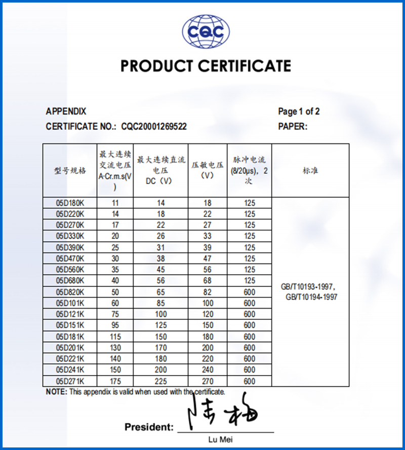 Agency Approvals Of The Disc Metal Oxide Varistor 05D270K